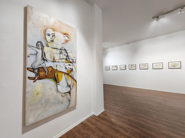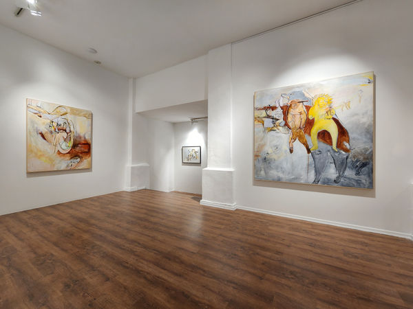 How can you belong somewhere when you are an expatriate, an immigrant, a foreigner, an outsider, a newcomer, a visitor, a guest; unfamiliar with the local customs and the language spoken? Movement has always been home for Janssen; her past as a professional dancer leaves clear traces in all of her paintings. In her new work, movement is investigated in a vast variety of shapes: twisting, running, roaring animals; bodies that curve and spin, unfold and crumble; waves of color and light; rocking horses and long hair thrown forcefully back forming vibrant curved lines.