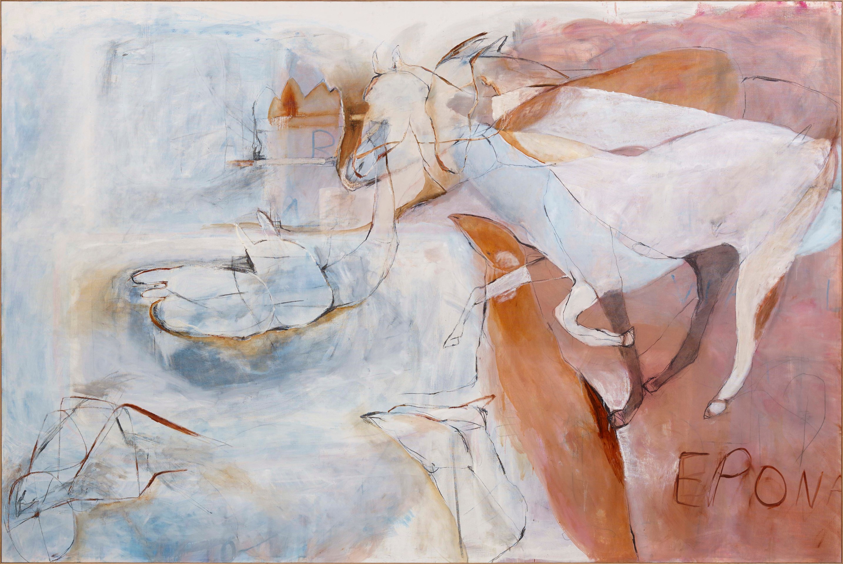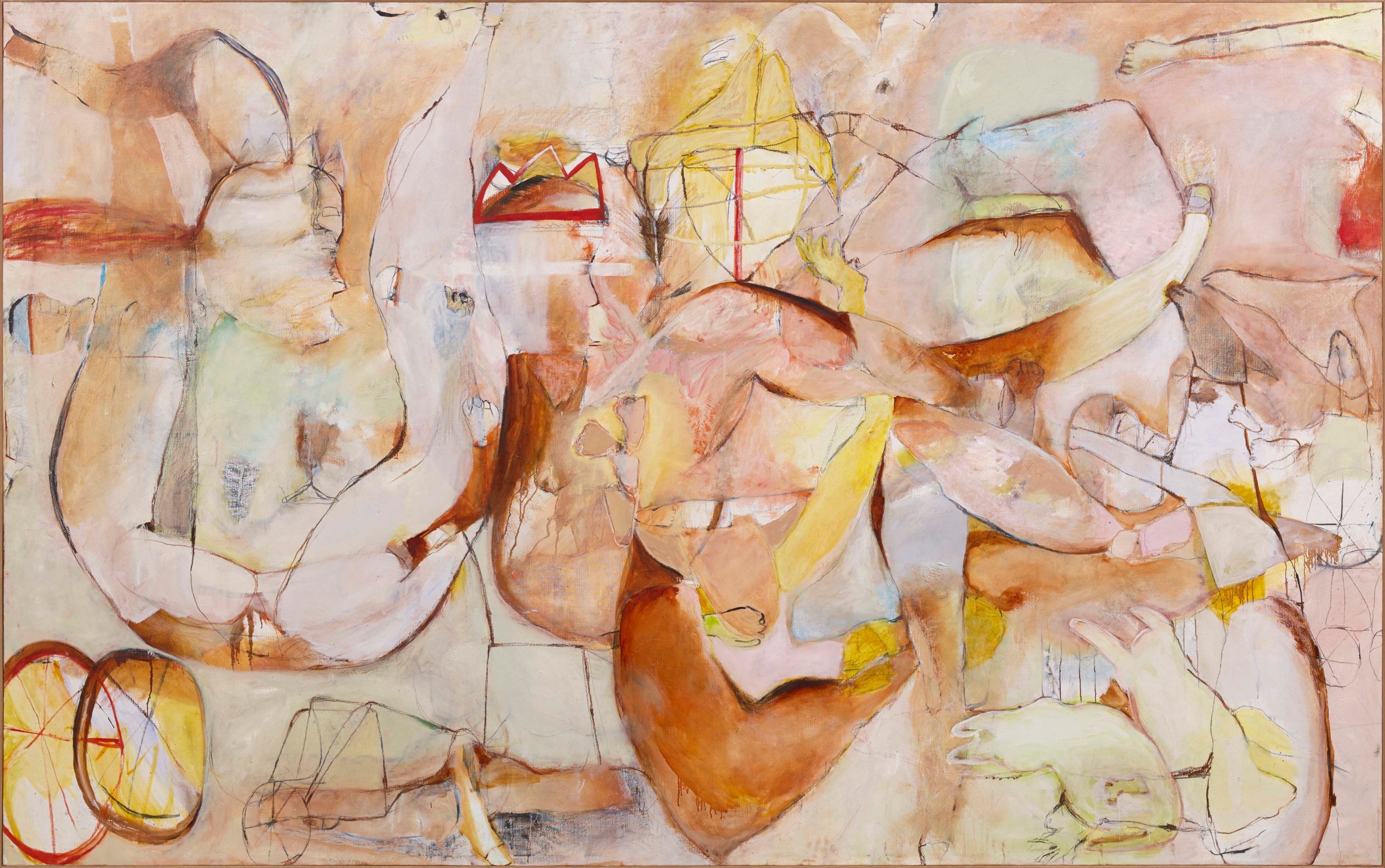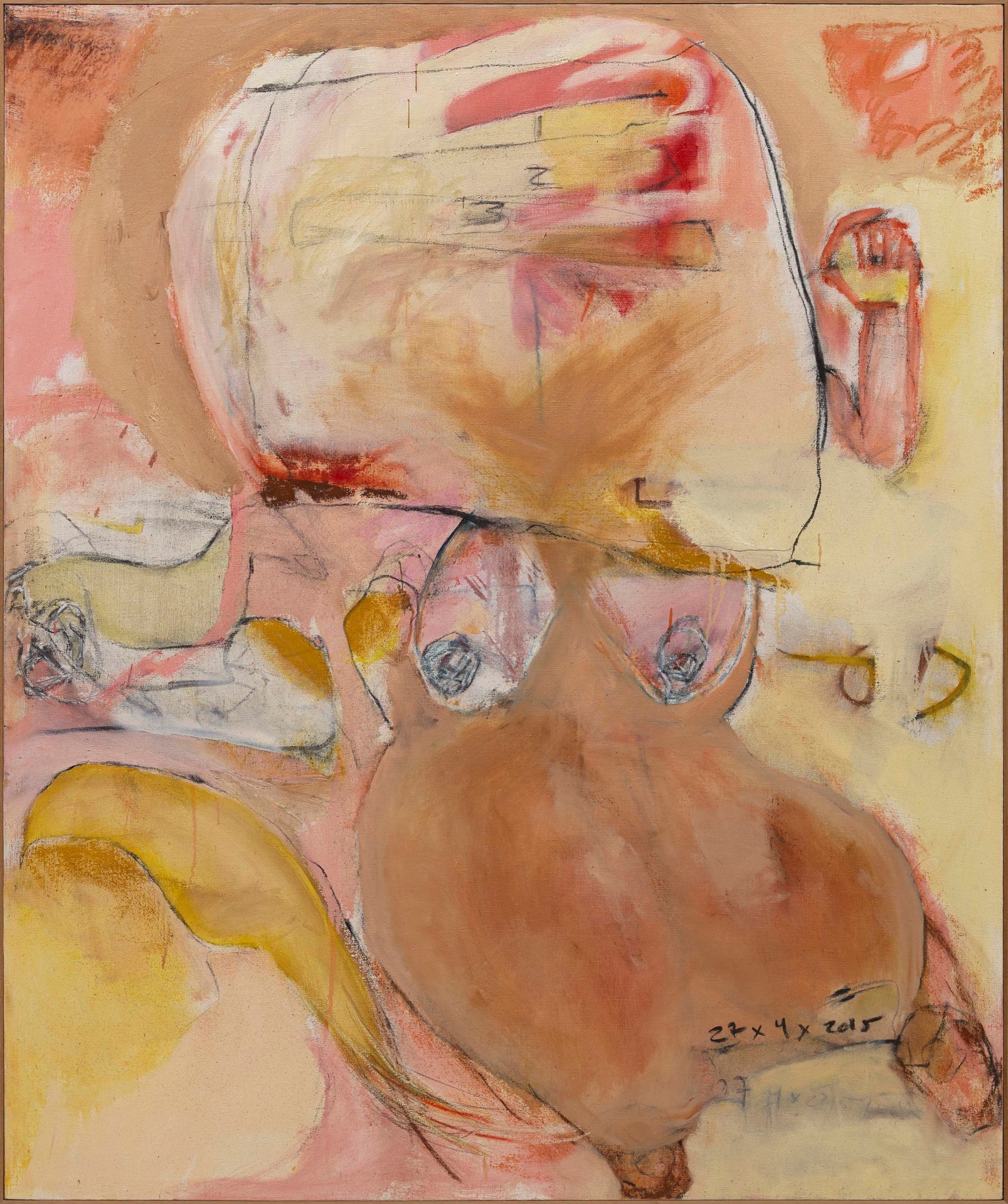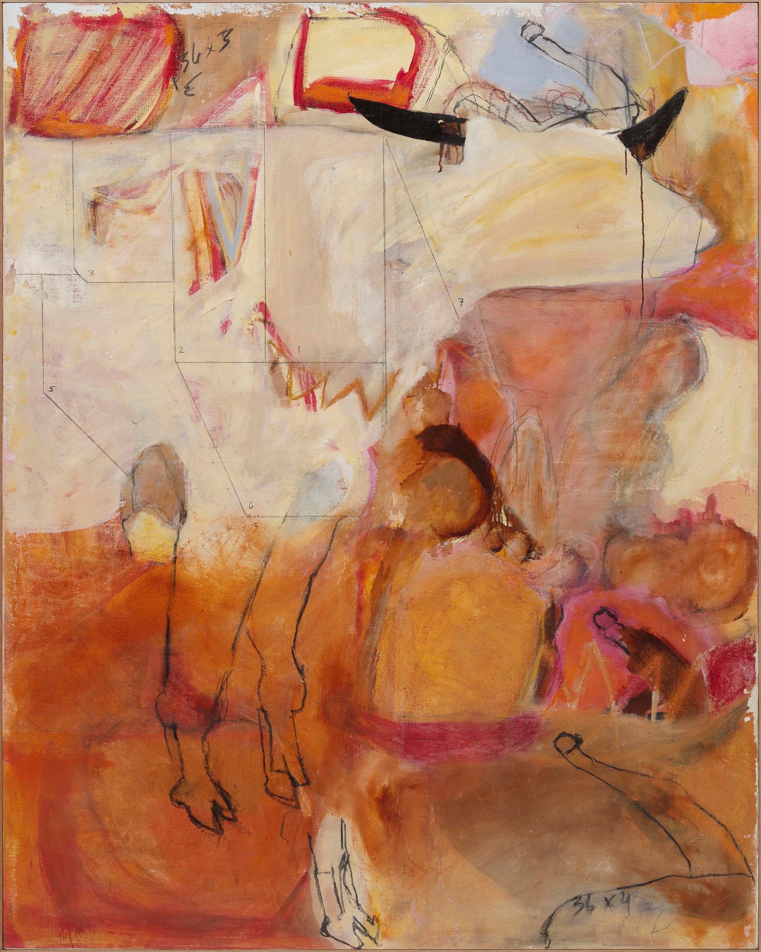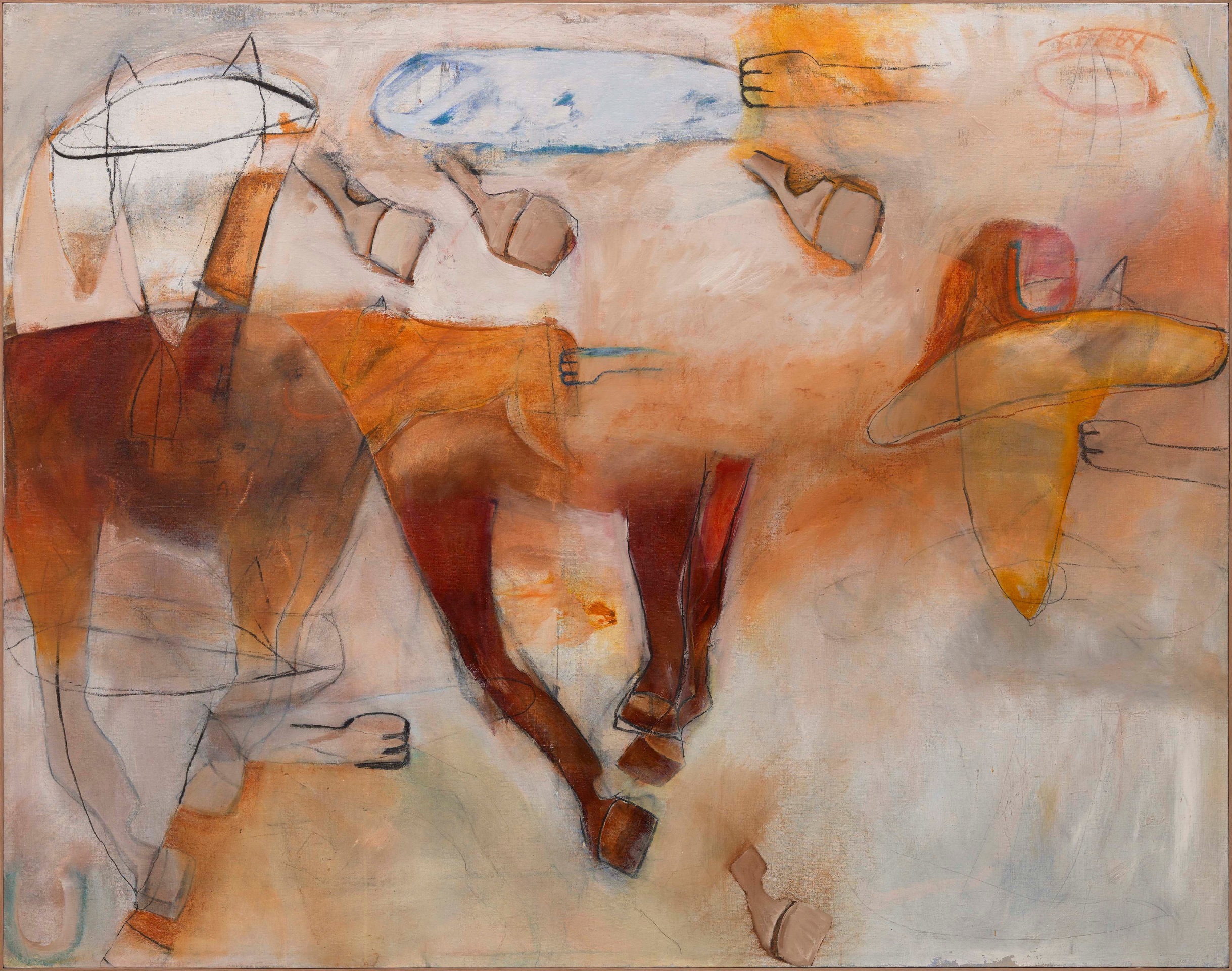 ‘All the King’s Horses’, a title taken from the famous English nursery rhyme, is a rich tapestry of body parts such as breasts, arms, phalli, and feet, animals including horses, numbers, and other seemingly random objects figuratively woven together in abstract expressionist form, tell a story and elucidate a complex thought process, capturing the primal movements in her mind, which previously came from her body.