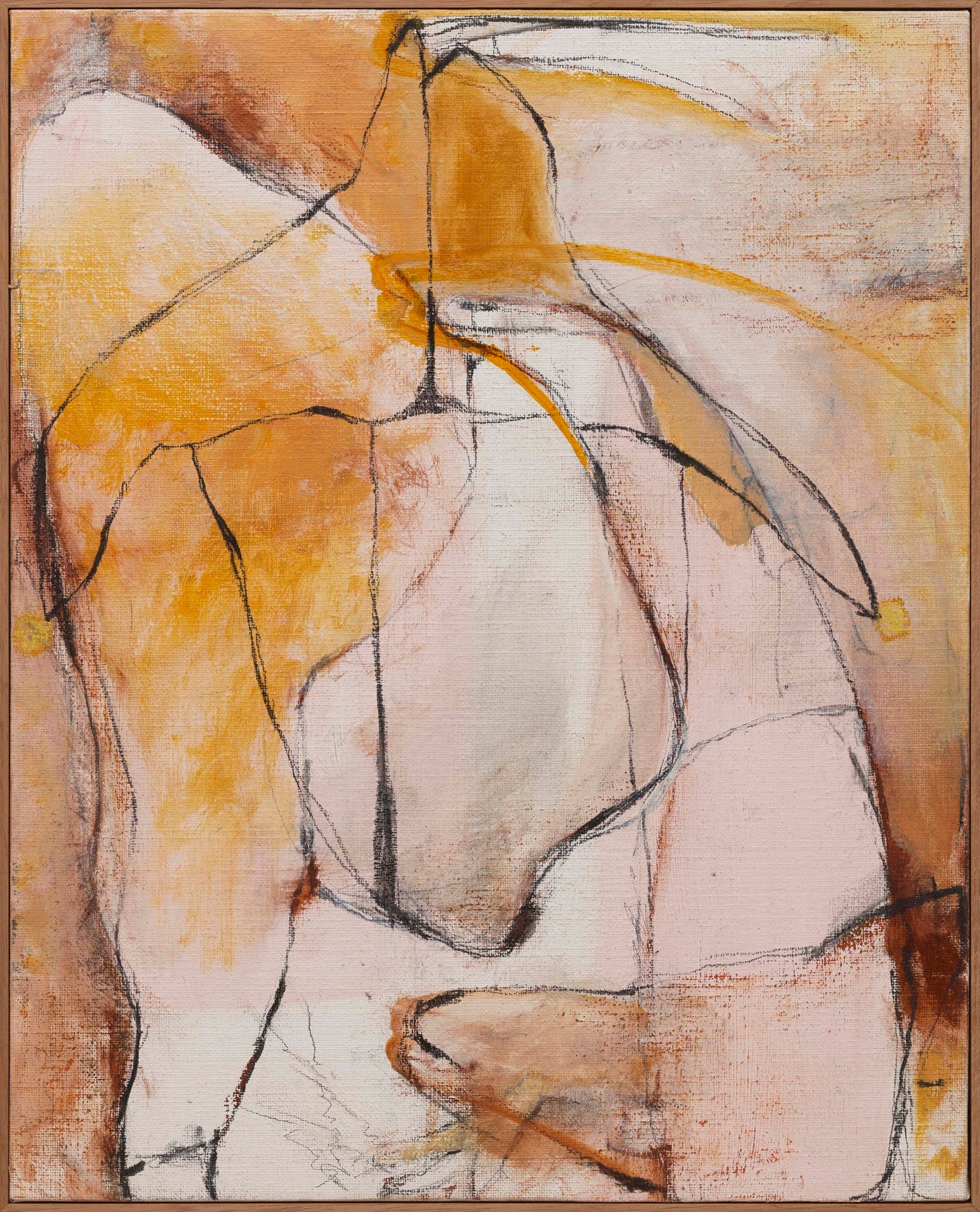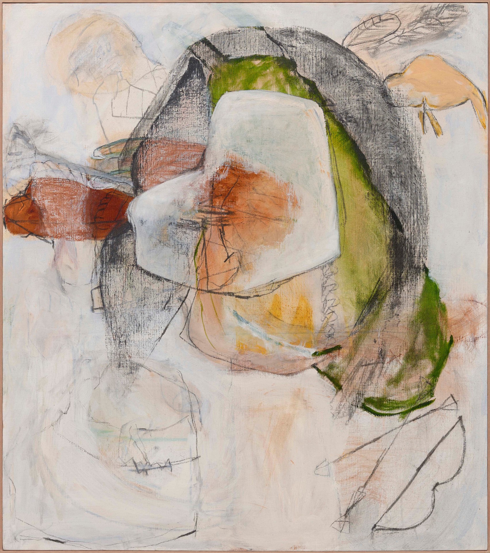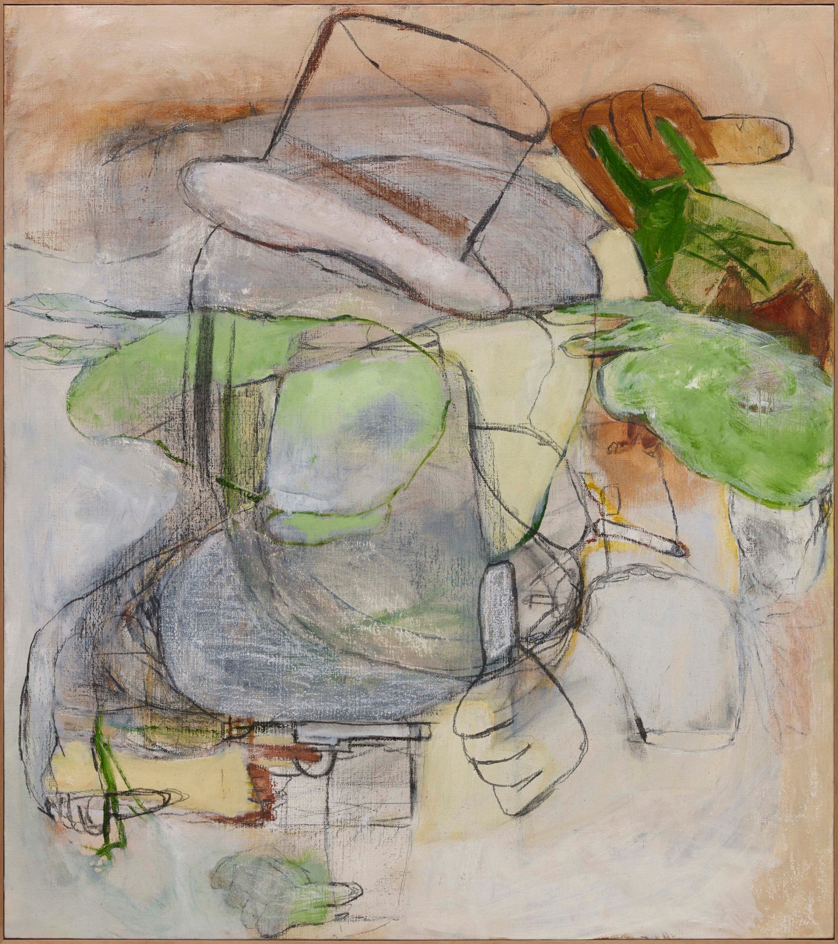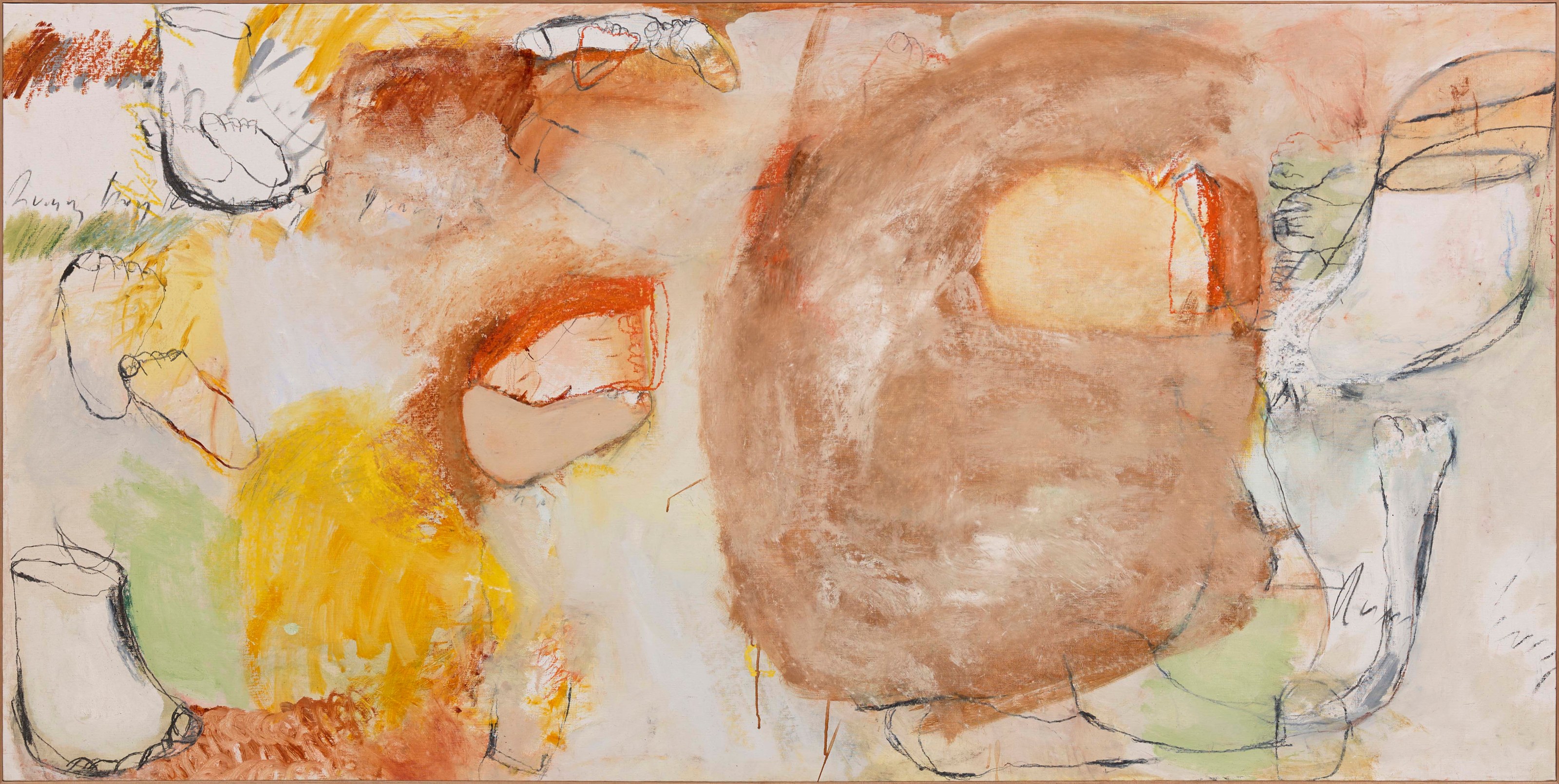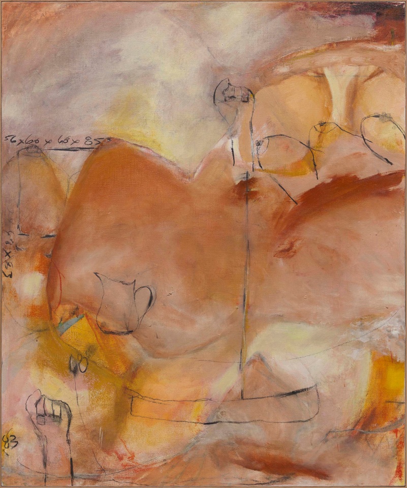 ‘All the King’s Horses’, a title taken from the famous English nursery rhyme, is a rich tapestry of body parts such as breasts, arms, phalli, and feet, animals including horses, numbers, and other seemingly random objects figuratively woven together in abstract expressionist form, tell a story and elucidate a complex thought process, capturing the primal movements in her mind, which previously came from her body.