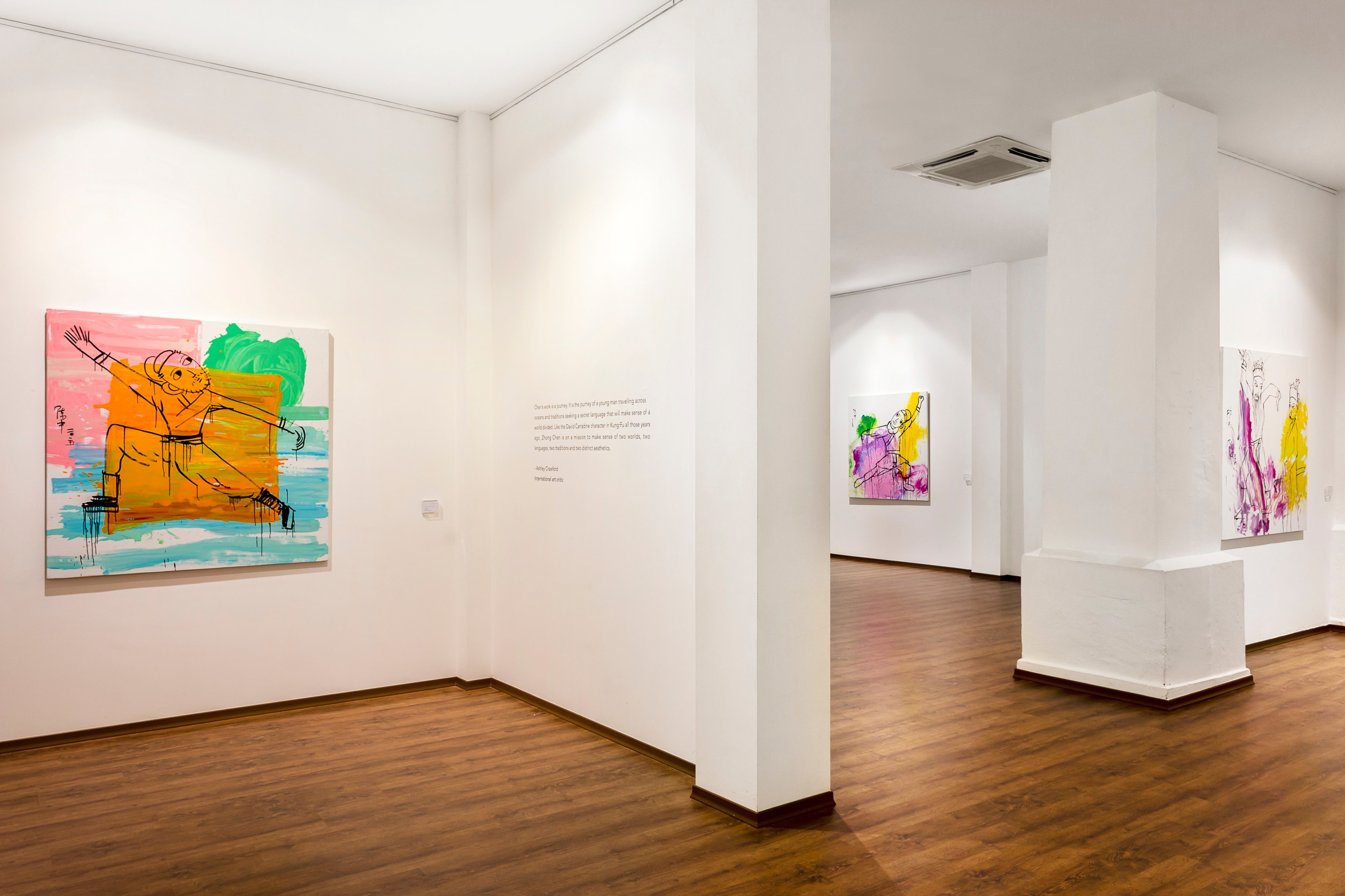 In this, his first solo show in Singapore, Chen exhibits works from his highly popular and acclaimed ‘The Kung-Fu Series’. Crossing the divide from the back streets of Shanghai to the exuberance of contemporary Australian culture, Chen’s works from ‘The Kung-Fu Series’ use calligraphic like black lines set against blocks of brilliant colour to depict figures brandishing swords, wearing elaborate headdresses, riding bizarre animals and casting furtive side-ways glances.  These works explore all the elements involved in Chen seeking a new life in one country whilst maintaining links to his Chinese heritage; Kung-Fu being an important part of Chen’s growing up both as a martial art he practiced and through the influence of cultural icons such as Bruce Lee.